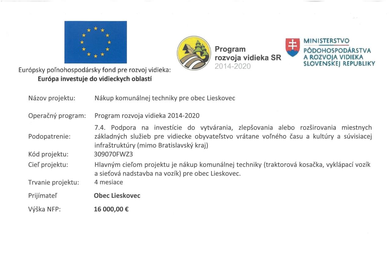 Projekt je realizovaný s podporou Európskeho poľnohospodárskeho fondu pre rozvoj vidieka. Hlavným cieľom projektu je nákup komunálnej techniky (traktorová kosačka, vyklápací vozík a sieťová nadstavba na vozík) pre obec Lieskovec.